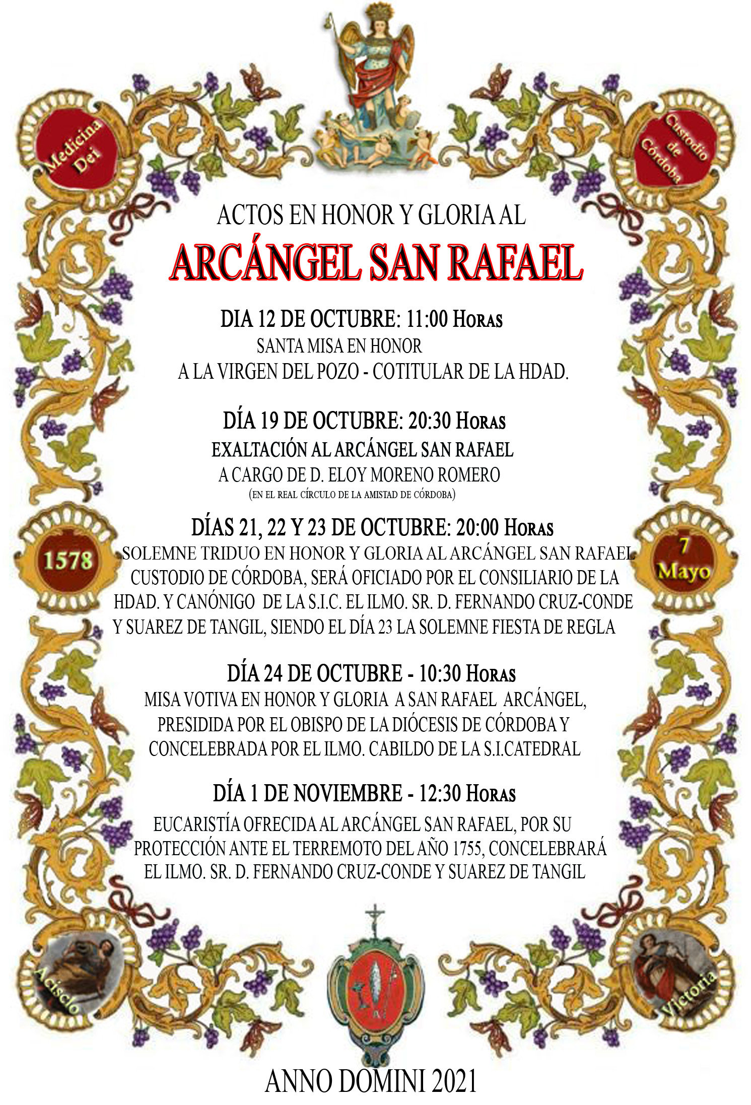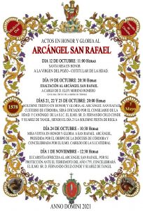 Durante este me de octubre la Ilustre Hermandad del Arcángel San Rafael Custodio de Córdoba, llevará a cabo una serie de actos en honor a su Titular, dentro de la programación de los mismos, ofrecerá  el día 12 una  Eucaristía a su Cotitular la Virgen del Pozo,  el día 19 la X Exaltación al Arcángel San Rafael, los cultos Triduo los días 21, 22 y 23, siendo el día 23 la fiesta de Reglas de la Hermandad, el día 24 Festividad del Arcángel, Misa Votiva presidida por el Obispo de la Diócesis de Córdoba y finalizan los actos con una  Eucaristía el día 1 de noviembre ofrecida al Arcángel San Rafael por su protección ante el terremoto del 1755.