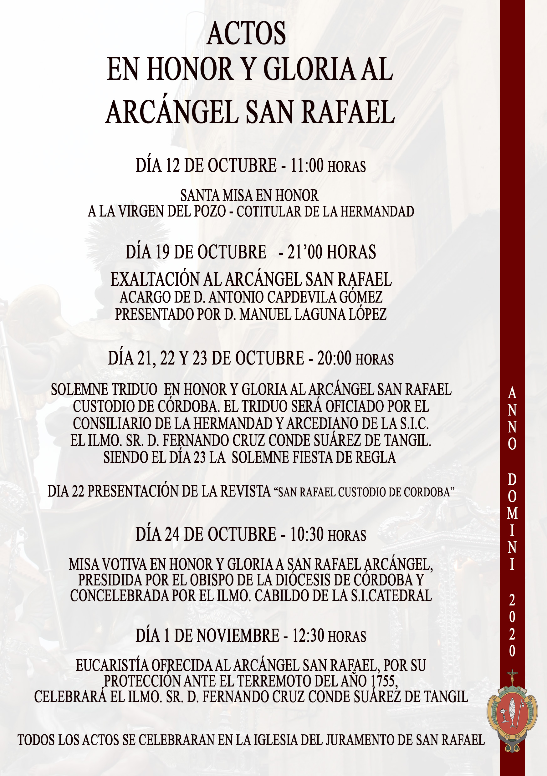 La Ilustre Hermandad del Arcángel San Rafael Custodio de Córdoba, durante el mes de octubre celebrará los Cultos en Honor y Gloria al Arcángel San Rafael con motivo de su festividad del 24 de Octubre.