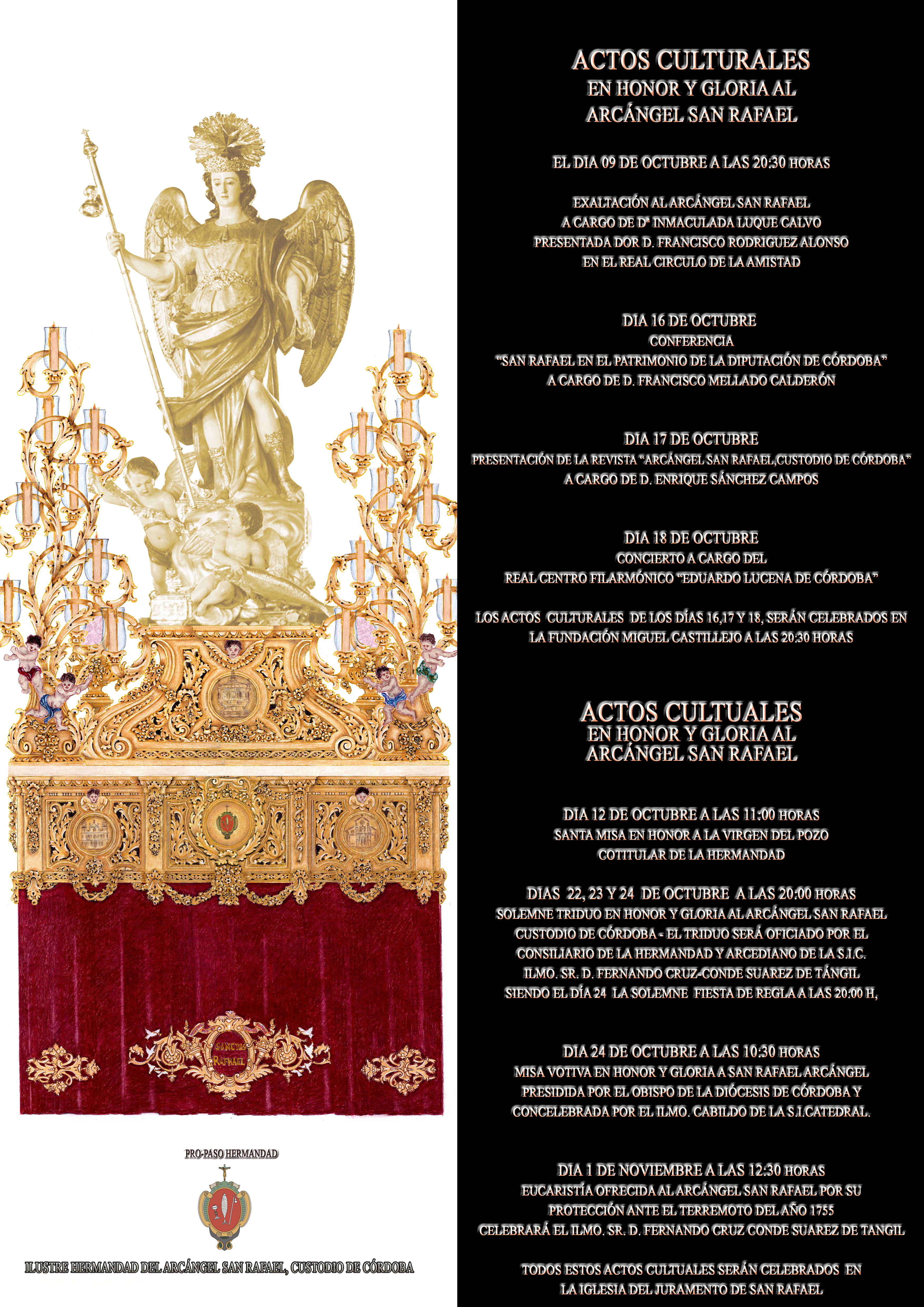 La programación de los actos a celebrar en el mes de Octubre, con motivo de la festividad de nuestro Titular, el Arcángel San Rafael, serán los siguientes: